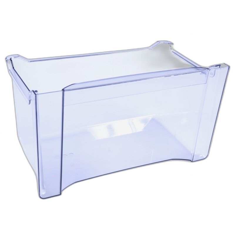 Diese Schublade präsentiert sich als einteiliges Kunststoffelement (transparent), das in den unteren Teil des Gefrierschranks eingesetzt wird.