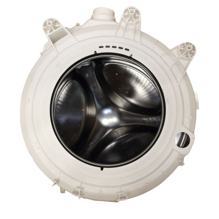 Die Waschwanne ist ein großer Behälter aus verstärktem Kunststoff, der die Stahltrommel umgibt.