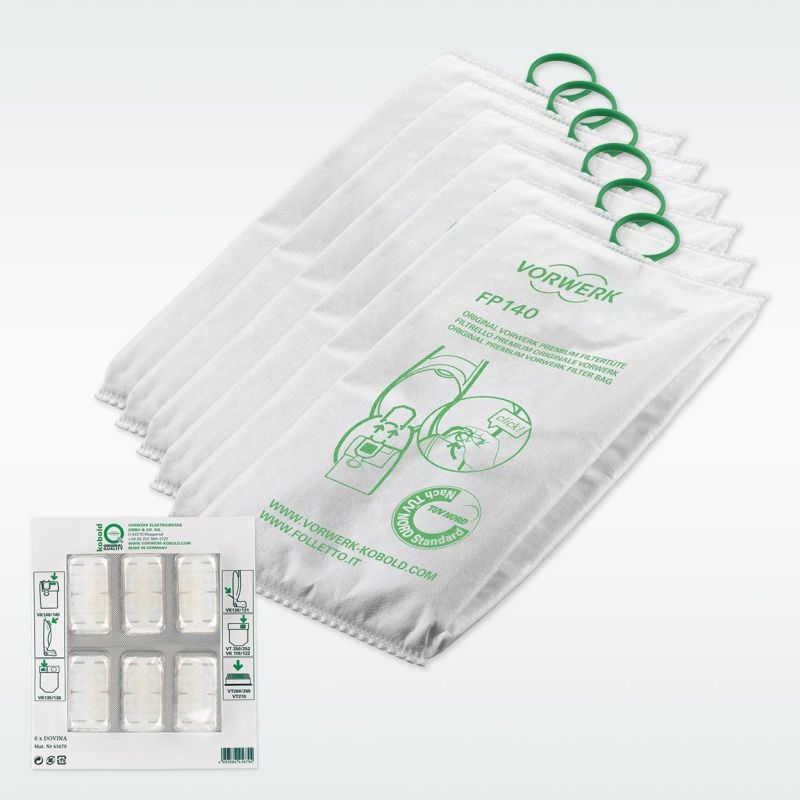 Paket 6 Filtrello VK150 und VK140 und 6 Dovina (Duftstoffe) für Vorwerk Folletto Staubsauger. Die Beutel sind mit der innovativen Filtertechnologie ausgestattet, die in der Lage ist, 99,8% des Staubs durch die 5 Mikrofaserschichten zurückzuhalten, sodass der Staubsauger keinen HEPA-Filter benötigt.
